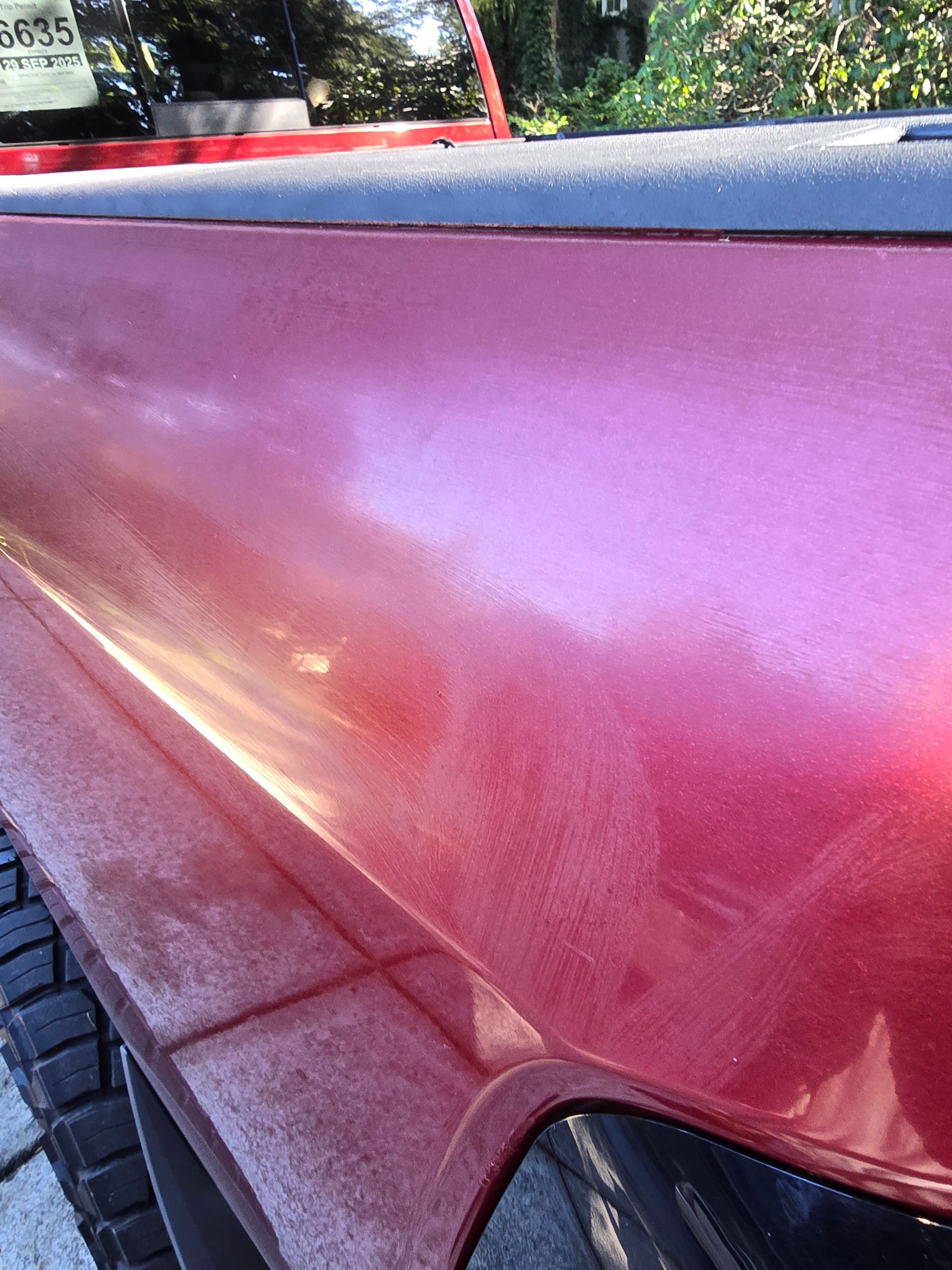 Big Red before exterior detail, water spot treatment, cut, buff and polish.